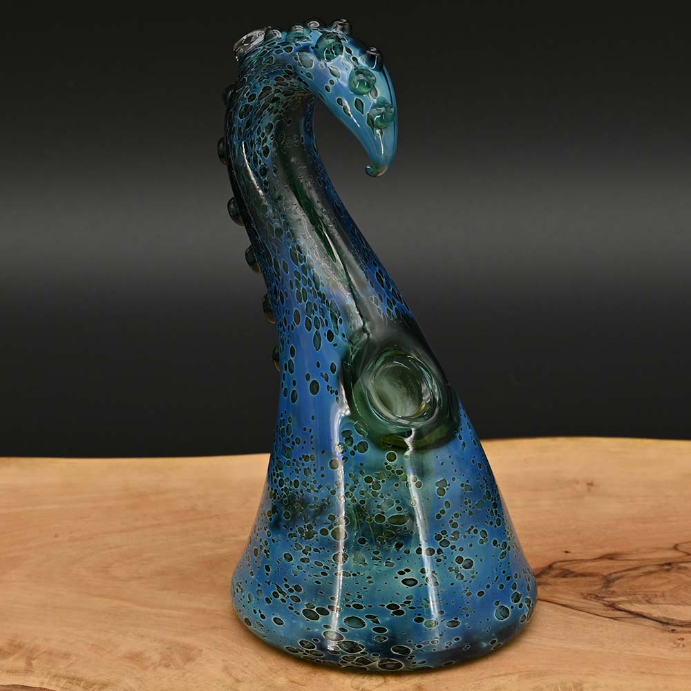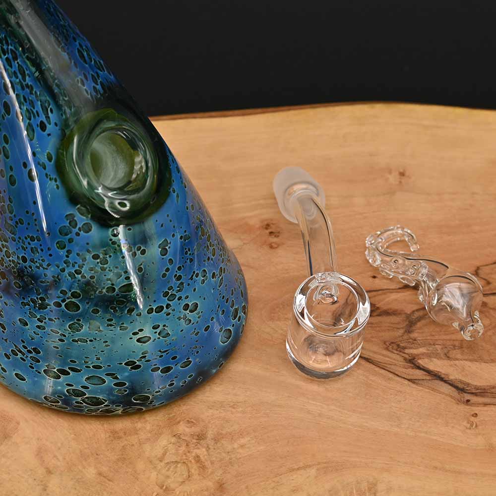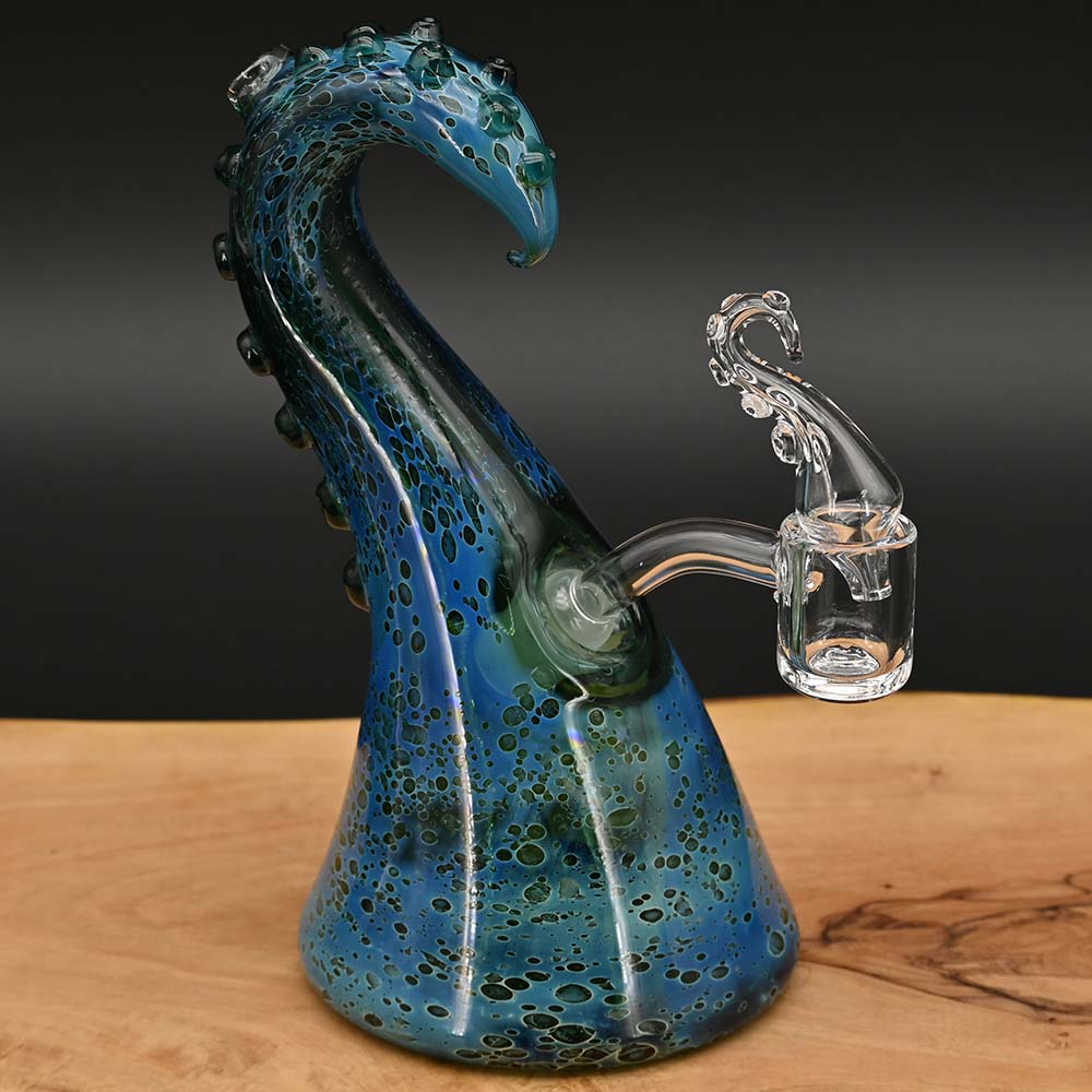 Gefertigt aus wunderschönem, buntem und gemustertem Borosilikatglas, ist dieser Arm eines Oktopus eine funktionale Dab Rig, die mit einem Banger ausgestattet ist. Eine passende Carb Cap in Form einer kleinen Oktopus-Tentakel ist ebenfalls dabei. Die Form mit den Tentakelschuppen macht die Ölpfeife sehr griffig. Im Inneren gibt es einen Lochperkolator, der durch starke Luft- und Wasserverwirbelungen für eine angenehme Abkühlung des potenten Dampfs sorgt.
