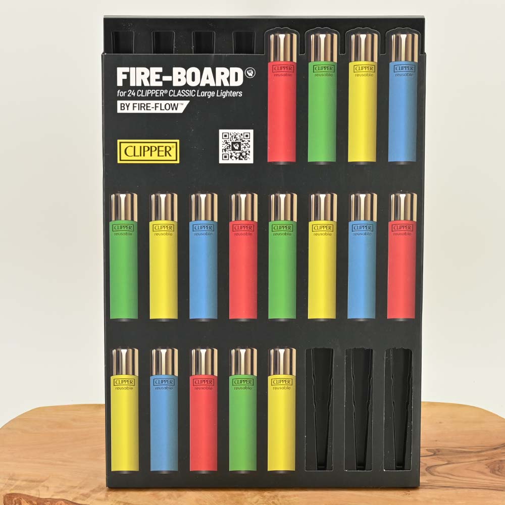 Entwickelt speziell für Sammler: Das FIRE-BOARD® 24er bietet eine stilvolle und praktische Möglichkeit, bis zu 24 CLIPPER CLASSIC Large Lighters zu präsentieren. Ob an der Wand, auf Möbeln oder auf Metalloberflächen – dieses Board verwandelt jede Sammlung in ein kunstvolles Ausstellungsstück.