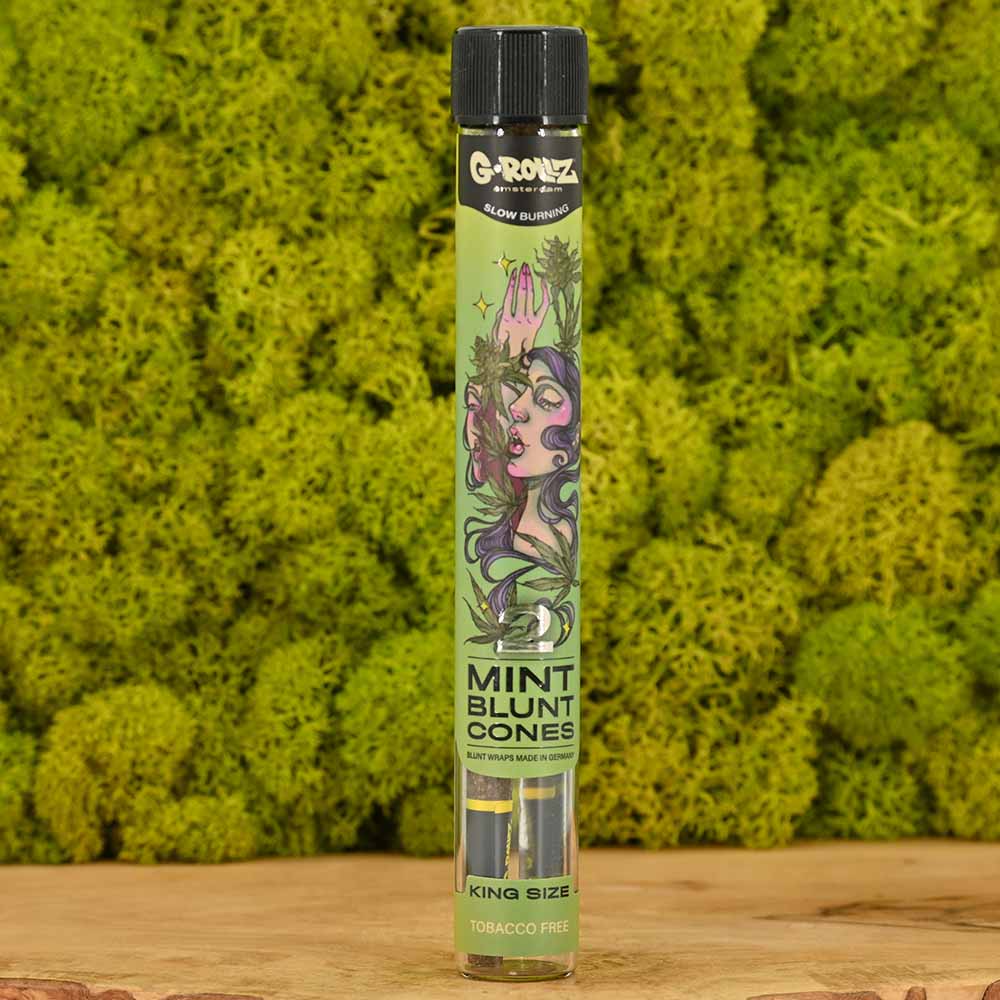 Diese G-Rollz Blunt Cones werden aus echten Minze BlĂ€ttern hergestellt, was fĂŒr ein langsames Abbrennen und ein natĂŒrlich erfrischendes Aroma sorgt.