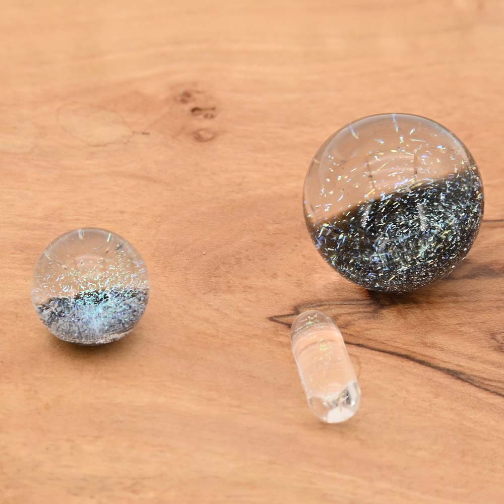 - 2x verschieden Große Glitzer-Quarzkugeln (Farben variieren)