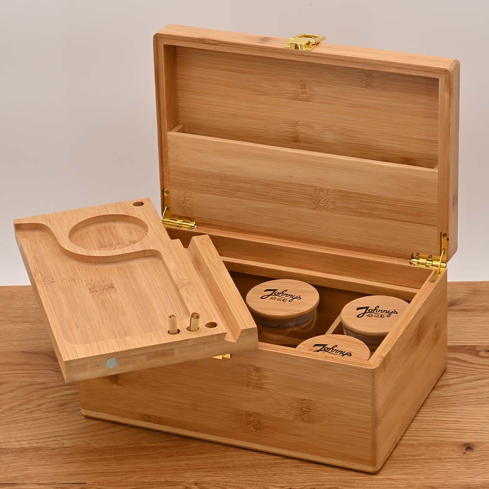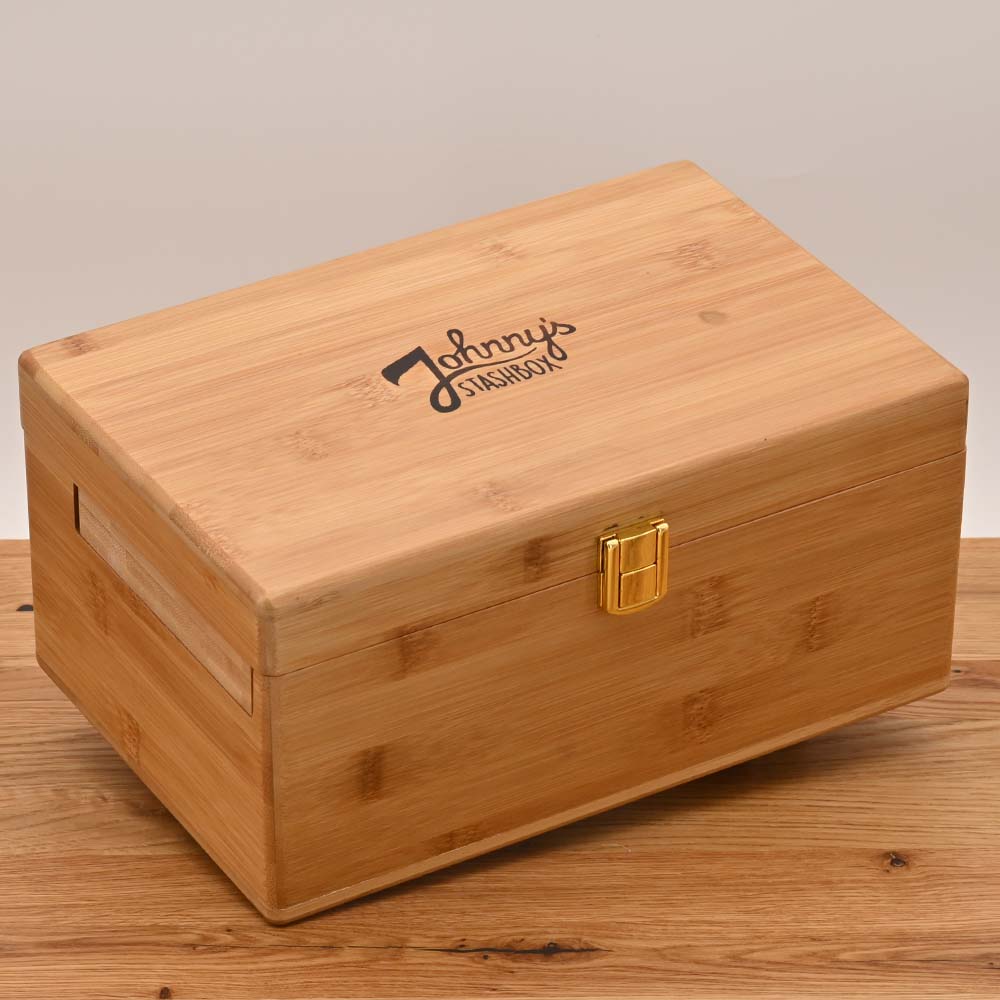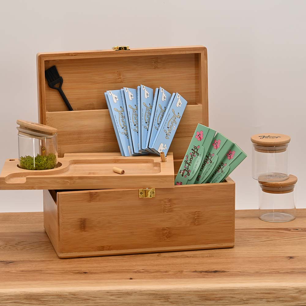 Papers hier, Filter da, der Grinder irgendwo zwischen Sofa und Couchtisch – klassisches Kiffer-Chaos. Die Johnnys Stash Box bringt alles an einen Platz. Bambus, abgerundete Kanten, magnetisches Tray zum schnellen Rausziehen – und innen genug Platz für alles, was du beim Bauen brauchst. Als Komplett-Set kommen direkt die passenden Johnnys Papers mit – du kannst also ohne Umweg loslegen.