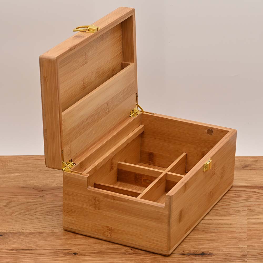 Bambus mit abgerundeten Kanten Nicht nur optisch ein Hingucker – die abgerundeten Kanten machen das Handling angenehm. Bambus ist robust, nachhaltig und sieht einfach besser aus als billige Plastikboxen. Die Box liegt bequem in der Hand und macht auf dem Tisch eine gute Figur.