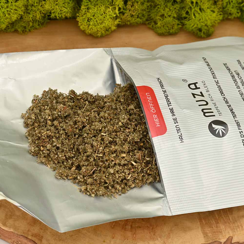Die terpenreichen Kräutermischungen von MUZA bieten ein unvergleichlich intensives und geschmackvolles Raucherlebnis. Jede Mischung wird mit größter Sorgfalt aus hochwertigen, natürlichen Zutaten hergestellt, die perfekt aufeinander abgestimmt sind. Dank der aromaschützenden Frischebeutel bleiben die erlesenen Kräuterextrakte und aromatischen Terpen-Verbindungen lange frisch und bewahren ihr volles Aroma.