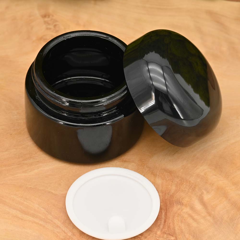 Kleiner Glastiegel aus Violettglas mit Kunststoffschraubdeckel und Einlegedeckel für Extrakte oder eine kleine Kräutermenge. Das violette Glas schützt den Inhalt optimal vor schädlicher Lichteinwirkung, die den molekularen Zersetzungsprozess beschleunigt. So wird die Haltbarkeit des Inhalts verlängert.